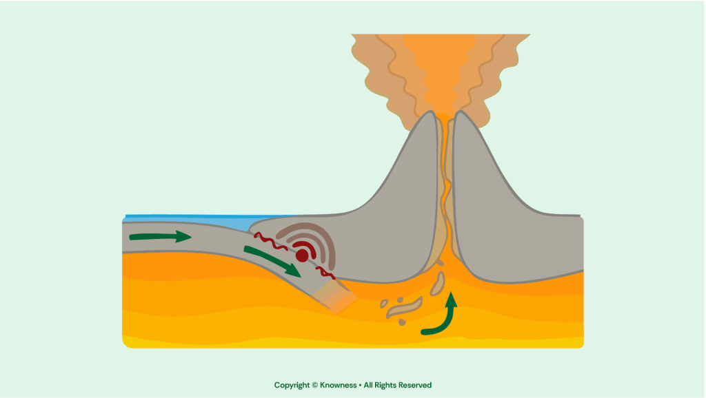 Destructive (also known as convergent) plate margins occur when two tectonic plates move toward each other. This collision often leads to one of the plates being forced beneath the other in a process called subduction. As the subducting plate sinks into the Earth’s mantle, it melts and generates intense heat and pressure. This, in turn, triggers volcanic eruptions and the formation of mountain ranges. Destructive plate boundaries are known for their geological activity, such as earthquakes, tsunamis, and volcanic eruptions forming composite volcanoes.