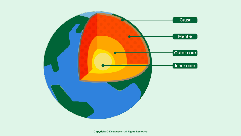 These layers, from the innermost to the outermost, are the inner core, outer core, mantle, and crust:
