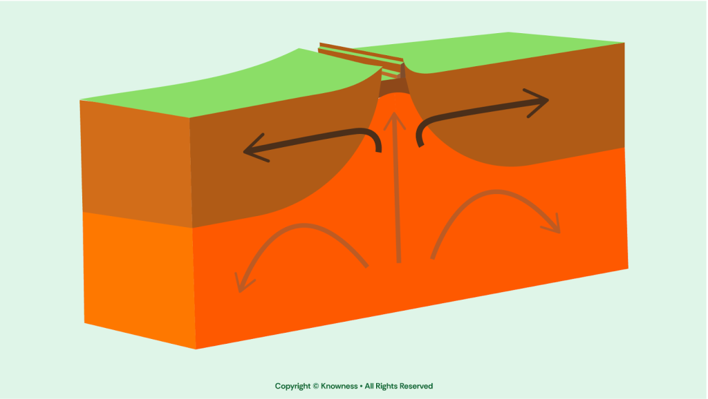 Another important cause of plate movement is called ridge push. This occurs at divergent (constructive) plate boundaries where two plates move apart and magma rises to form new crust, such as at mid-ocean ridges. As the new crust cools, it becomes denser and begins to slope away from the ridge. Gravity causes the new rock to slide down this slope, pushing the rest of the plate away from the ridge. This process helps to move the plates across the Earth’s surface.