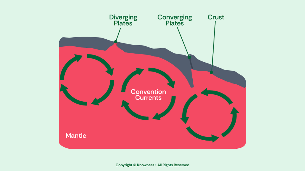 The movement of tectonic plates is caused by heat from inside the Earth, which generates convection currents in the mantle. These convection currents occur when hot molten rock near the core rises toward the surface, cools down, and then sinks again. This circular motion drags the plates above it, causing them to move in different directions.