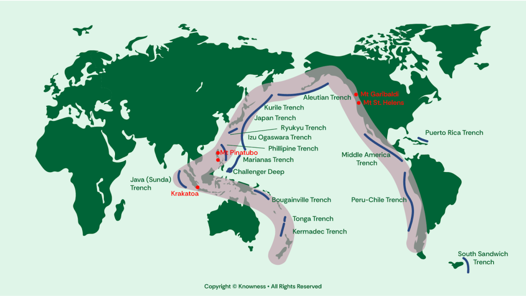 A similar pattern can be seen from volcanoes, with 75% of Earth’s total volcanoes located around the Pacific Ring of Fire. At destructive plate boundaries, where plates collide, often lead to volcanic formations of arcs and ridges whereas constructive boundaries, where plates move apart, create conditions for volcanic activity along mid-ocean ridges and rift zones.