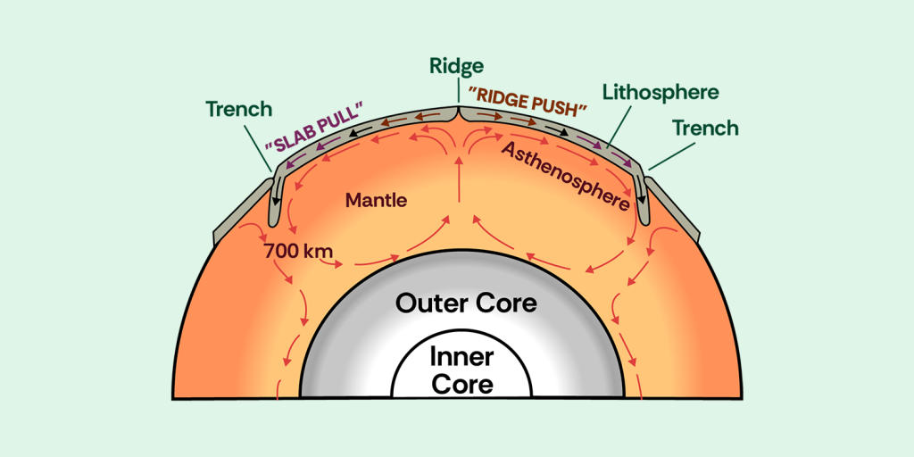 A third process, slab pull, happens at convergent (destructive) plate boundaries where an oceanic plate sinks beneath another plate into the mantle in a process called subduction. The sinking plate is cooler and denser than the surrounding mantle, so it sinks easily and pulls the rest of the plate down with it. This pulling force helps to drive the overall movement of the plate.