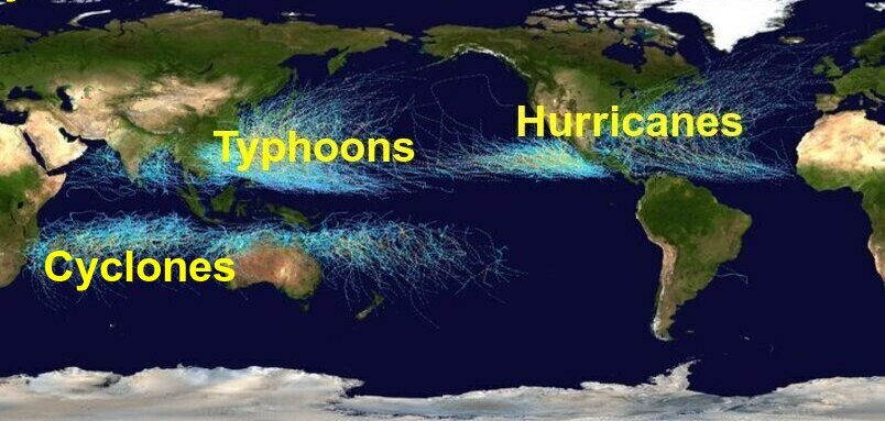 • Cyclones: Indian Ocean and South Pacific Ocean.